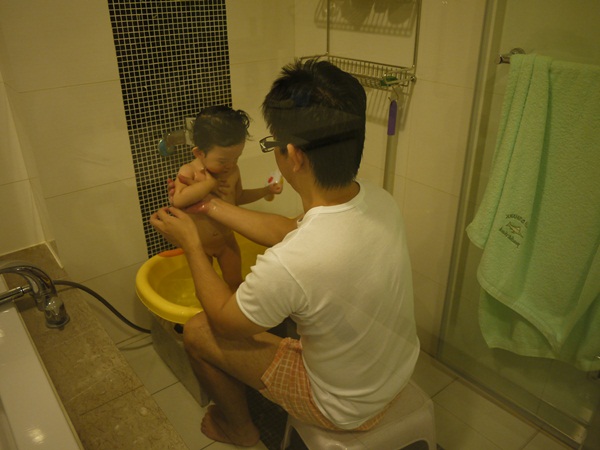 現在爸爸回台灣,and加上我有雞丁洗澡比較不方便,所以通常寶包恩澎澎歡樂時間都是爸爸主持