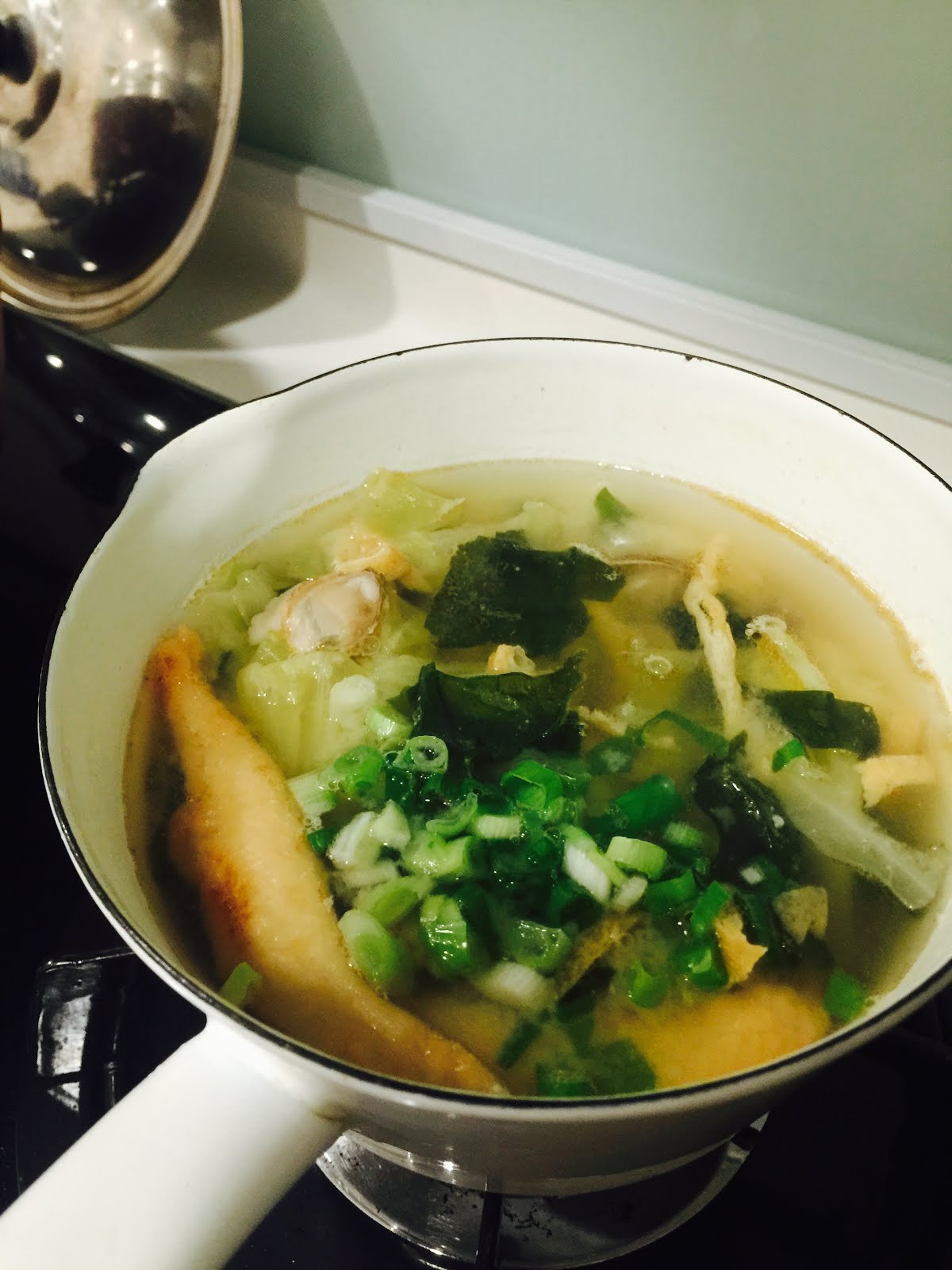 步驟:一樣先煮水,水滾後弄散味增之放入滾水,再依序加入海帶芽、高麗菜、蛤蜊,