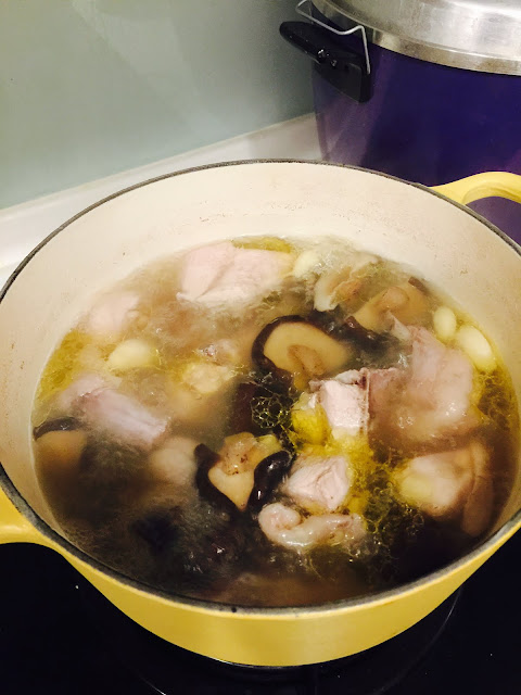 先用熱水泡好香菇後,一樣滾水後,依序丟入雞肉中火五分鐘轉小火十分鐘,再放入香菇跟蒜頭燉15分鐘。這道雖然有超過20分鐘,但其實那20分鐘你只要翹腳看韓劇後就可以熄火了