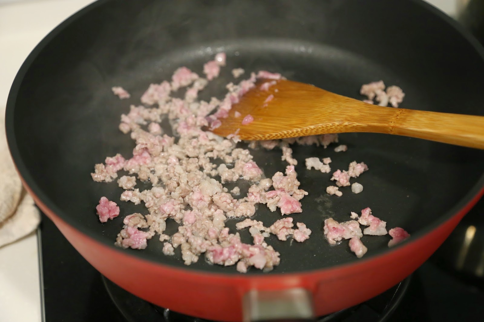 先熱鍋把絞肉炒出肉香味,ㄎㄥˋ乓一下