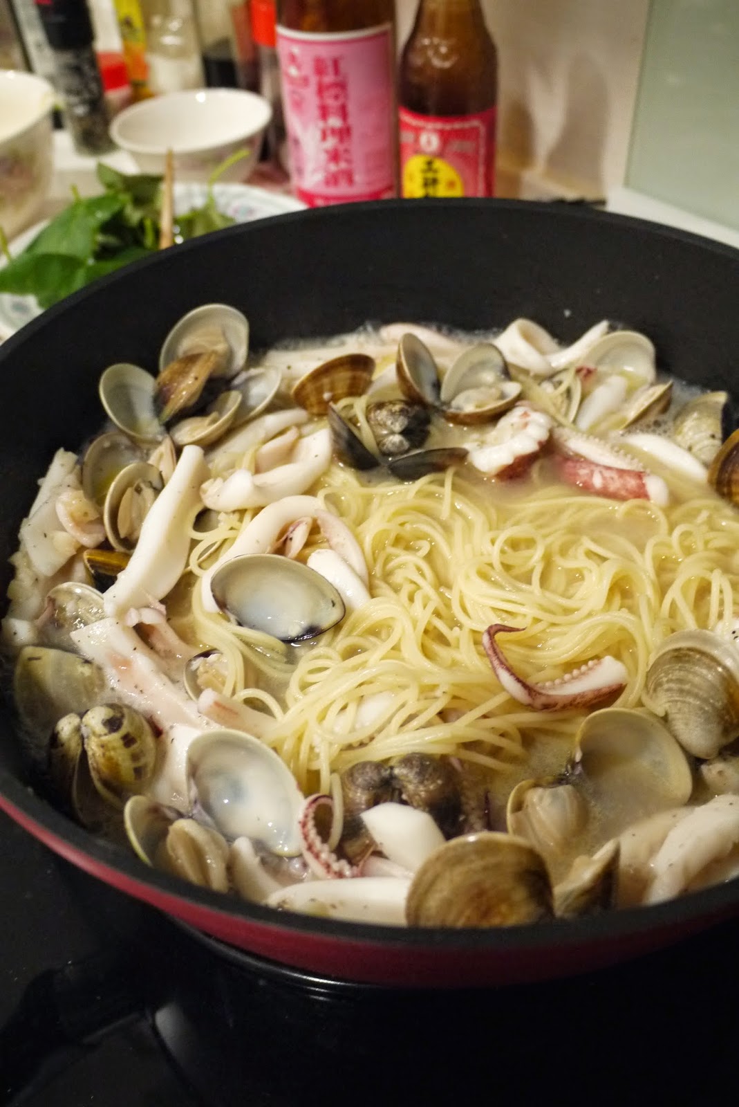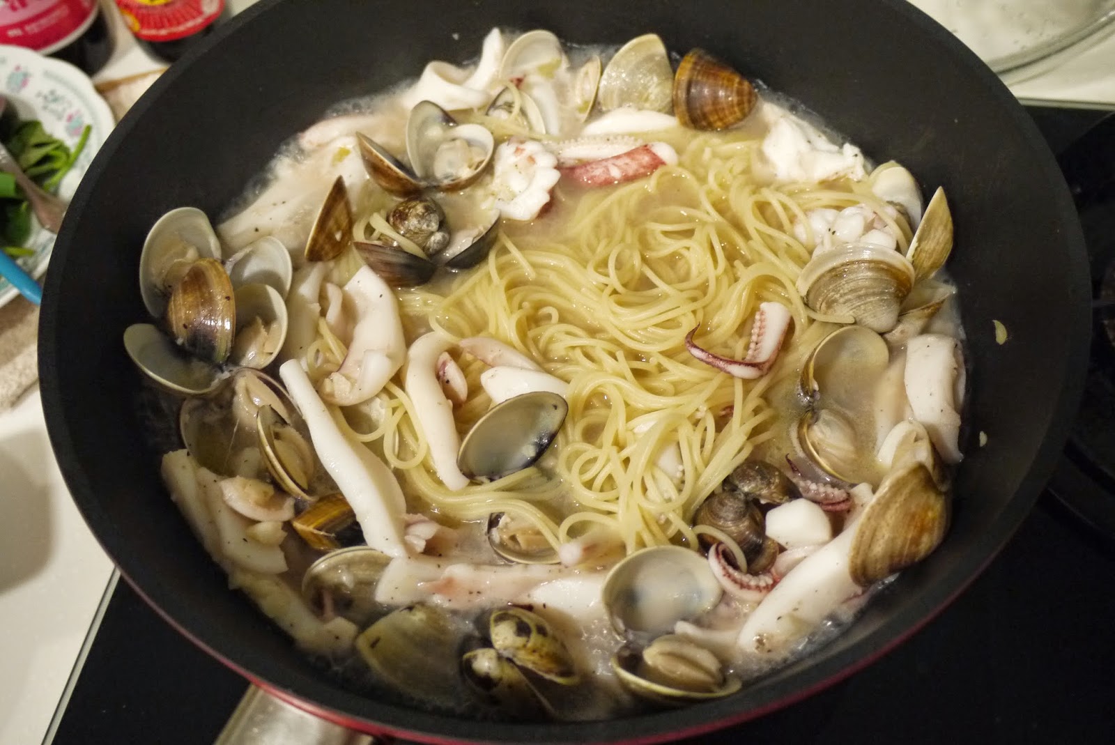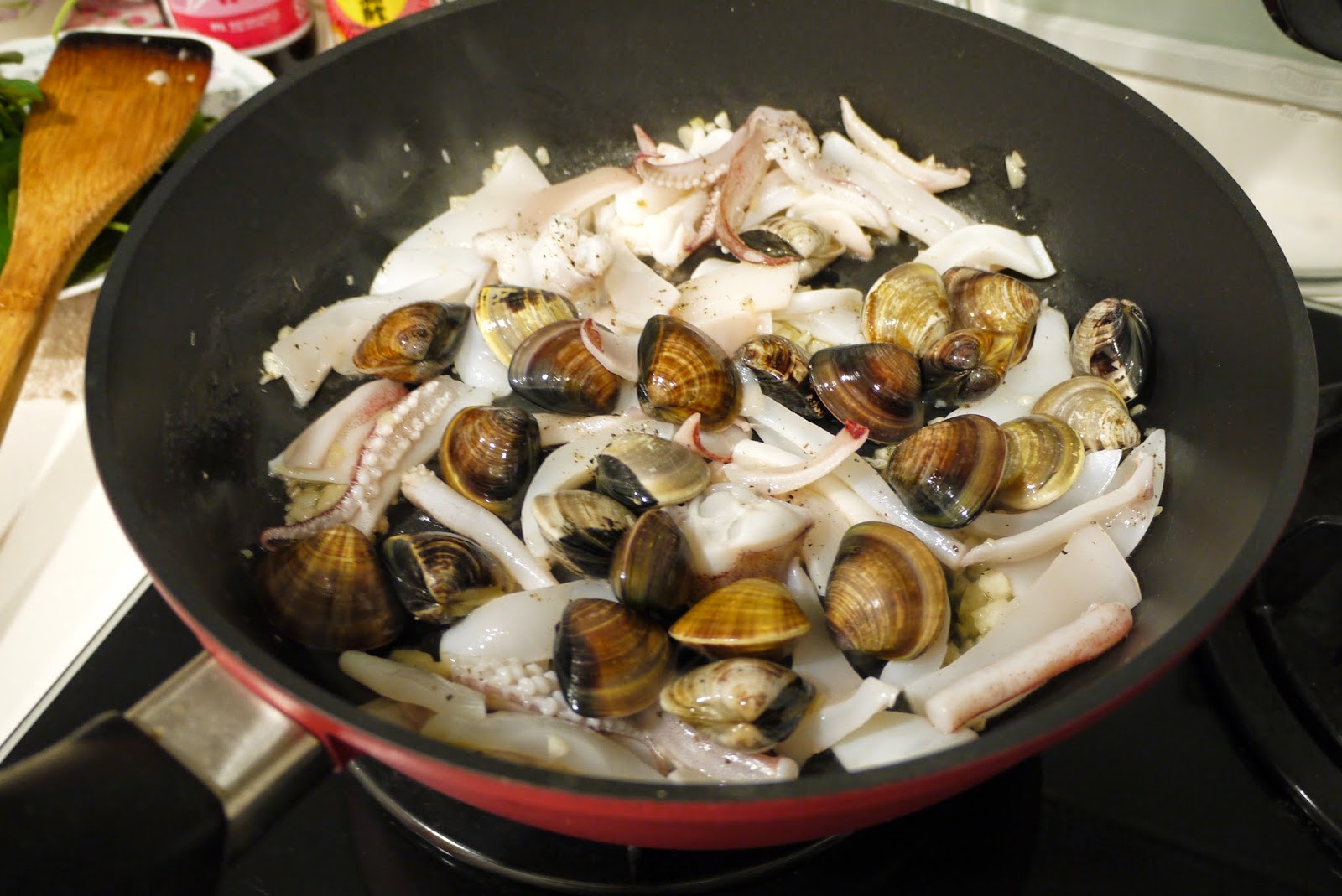 再來依序把花枝、蛤梨放入之後,再加入兩湯匙的麵湯(剛剛煮義大利麵的水就可以了)