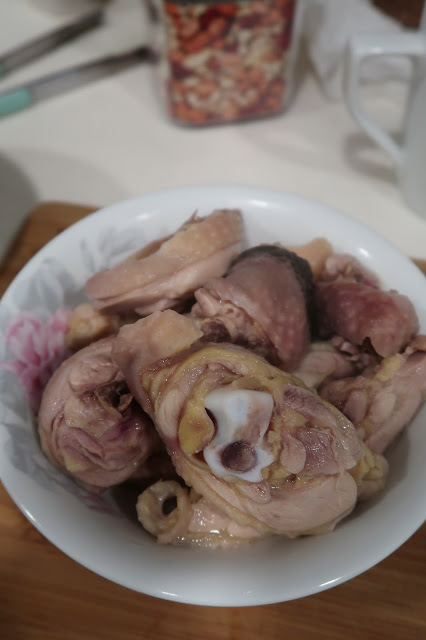 然後水滾後立刻丟入雞肉,通常我滾燙約三分鐘就可以夾起來。