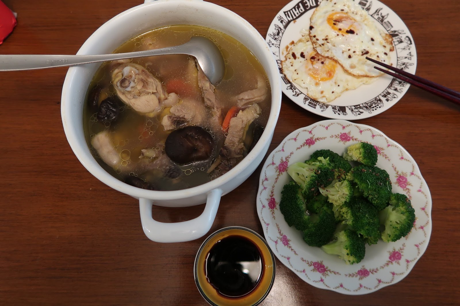 因為我家就只剩乾香菇、姑姑自己曬的老菜埔(但其實他是新生兒只有兩歲的年紀)跟雞肉,所以我就是一種清冰箱概念的立冬香菇雞湯。