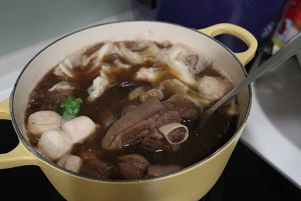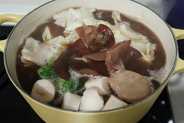 因為受熱很快所以很省瓦斯,中火滾約10分鐘後依序把泡好的香菇、菜ㄅㄡˋ通通丟進去。