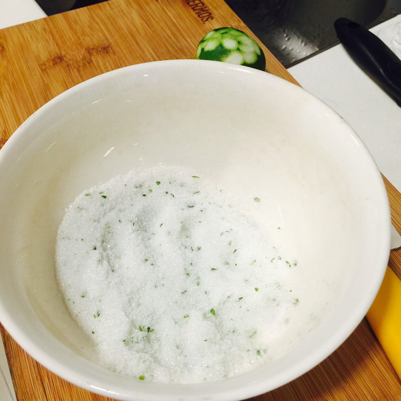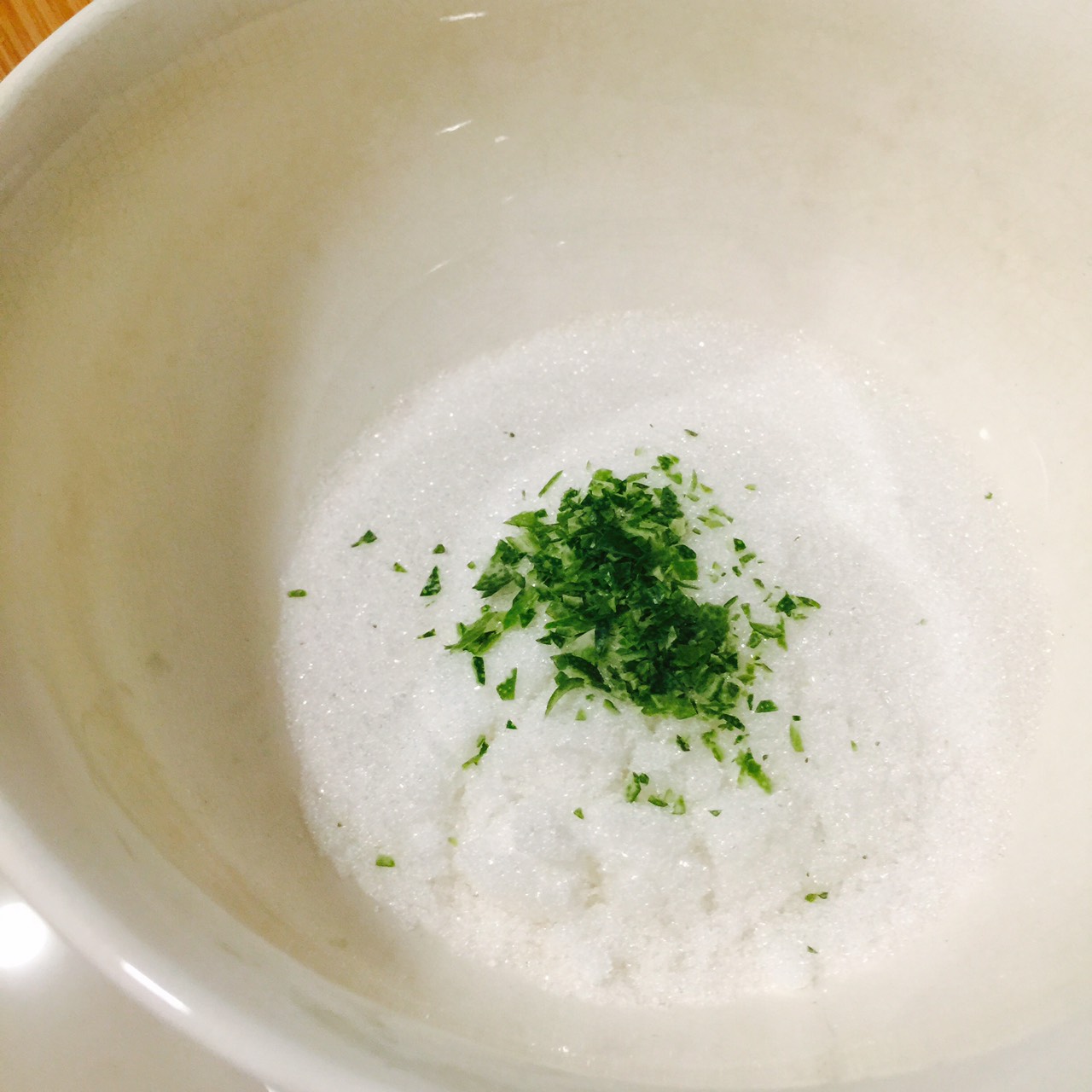 細砂糖跟檸檬皮屑屑混合在一起可以用手搓揉讓檸檬的香氣跑出來