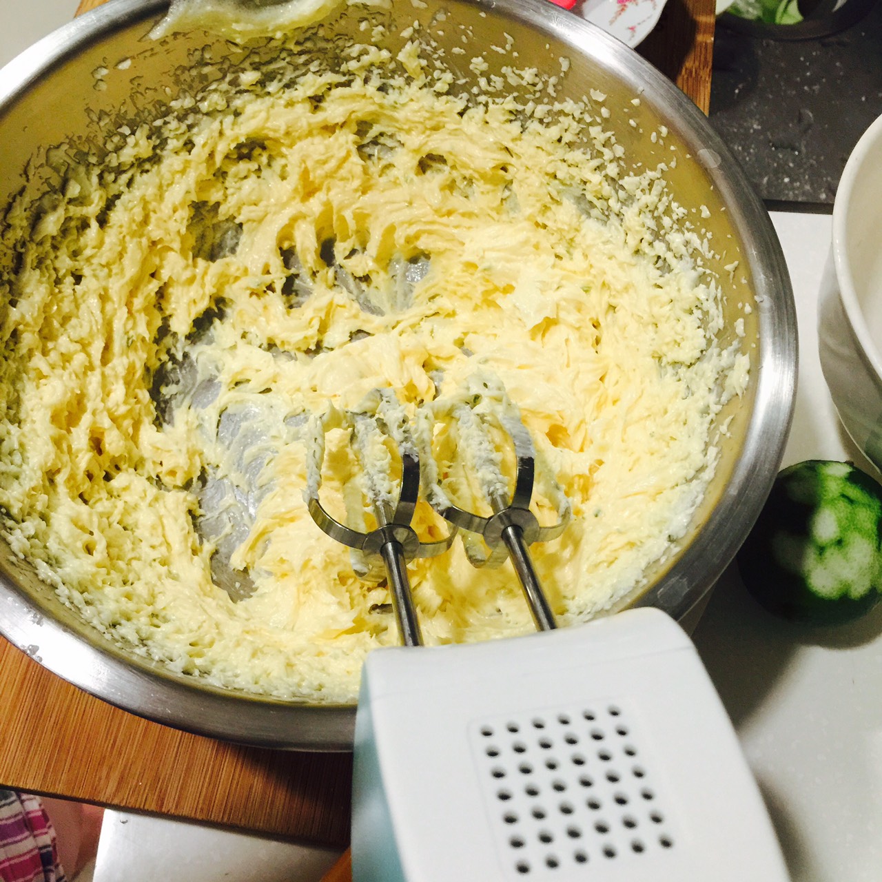 步驟一:先把奶油跟砂糖(分三次放入)用低速打成綿密感即可。