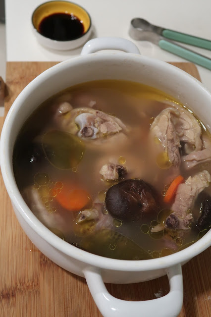 因為我家就只剩乾香菇、姑姑自己曬的老菜埔(但其實他是新生兒只有兩歲的年紀)跟雞肉,所以我就是一種清冰箱概念的立冬香菇雞湯。