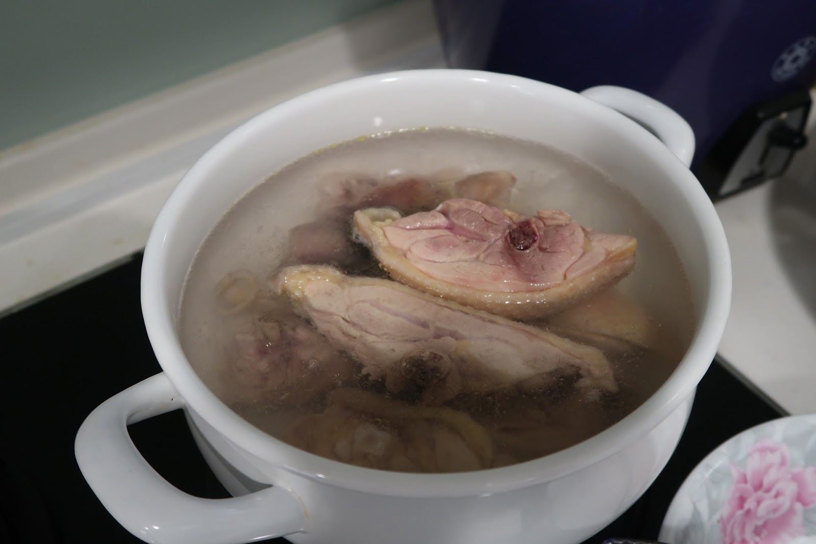 然後水滾後立刻丟入雞肉,通常我滾燙約三分鐘就可以夾起來。