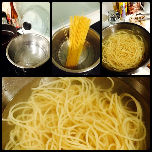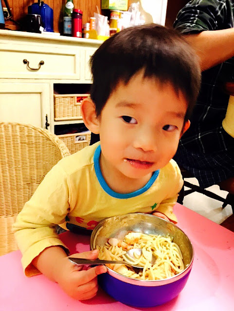 另外一鍋一起煮義大利麵,起一鍋水裡面放一匙鹽巴與橄欖油,若無橄欖油沙拉油也可以,這款麵條煮8分鐘就好了,超級快,因為我也要給雞寶丁吃所以會煮軟一點。義大利人應該都已麵食為主食,我們也來私波ㄍㄟ踢一下吧!
