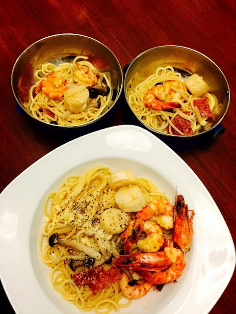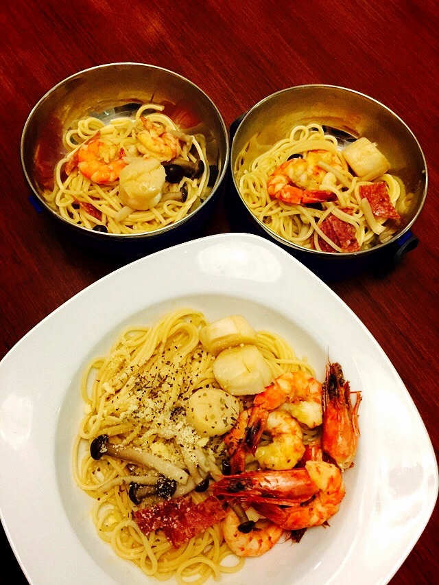 料炒好吃後就可以把剛剛煮好的義大利麵放入,注意煮義大利麵的水不要都,可加入兩大匙一起煮,再把撈起來半熟的干貝跟蝦子再次丟入,