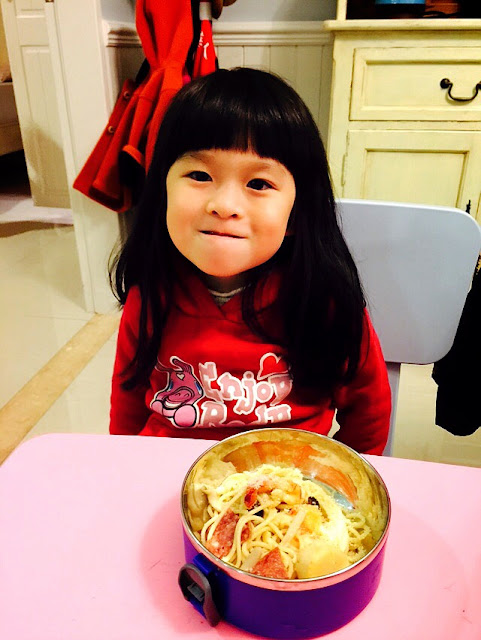 雞寶丁也一起跟我們吃義大利麵。天天吃白飯,偶爾換一下口味,她們會吃更快。
